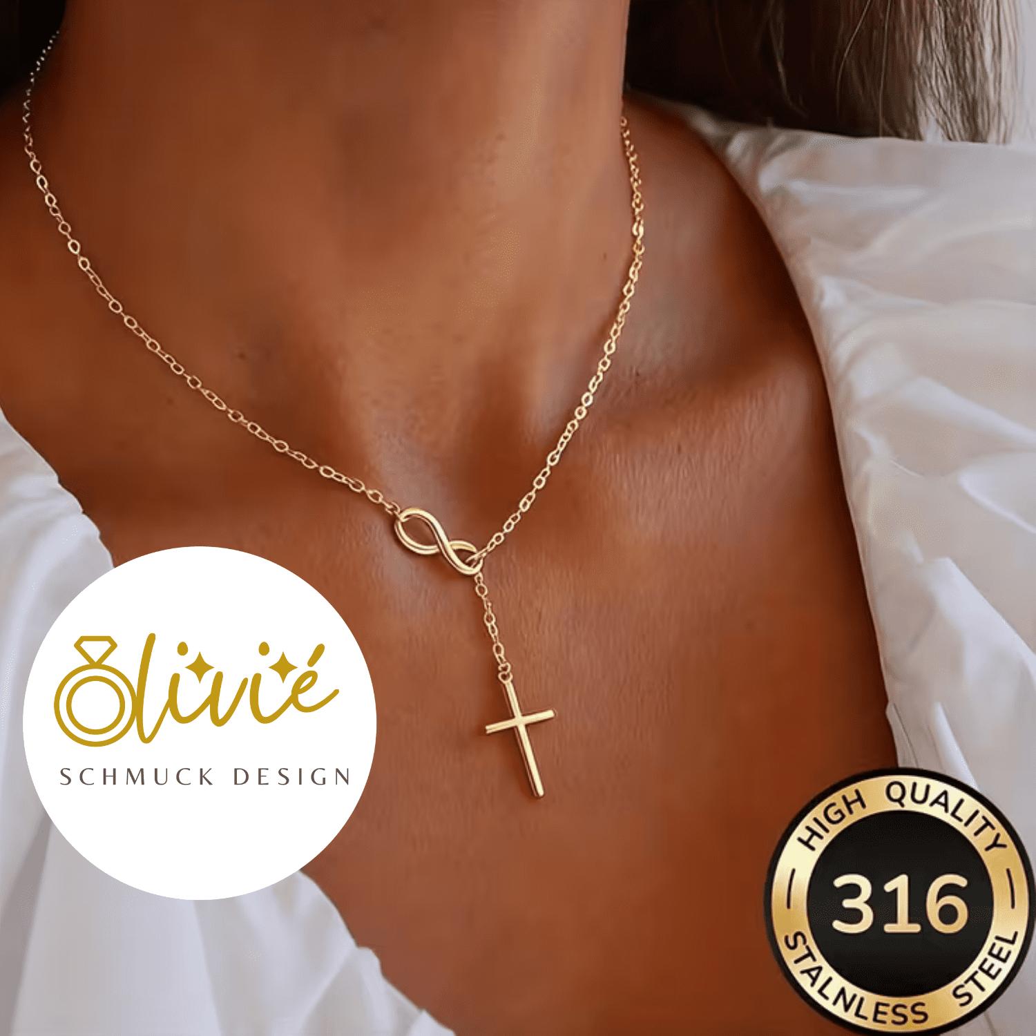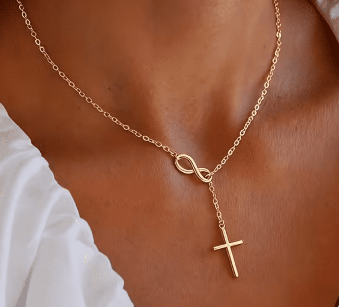 Diese goldfarbene Damen Kreuzkette verbindet zeitlose Eleganz mit tiefer Symbolik. Das schlichte Kreuz steht für Glauben und Schutz, während die Unendlichkeitsschleife Liebe, Verbundenheit und Beständigkeit symbolisiert. Das klare, reduzierte Design macht die Kette zu einem dezenten Schmuckstück mit starker Aussage.