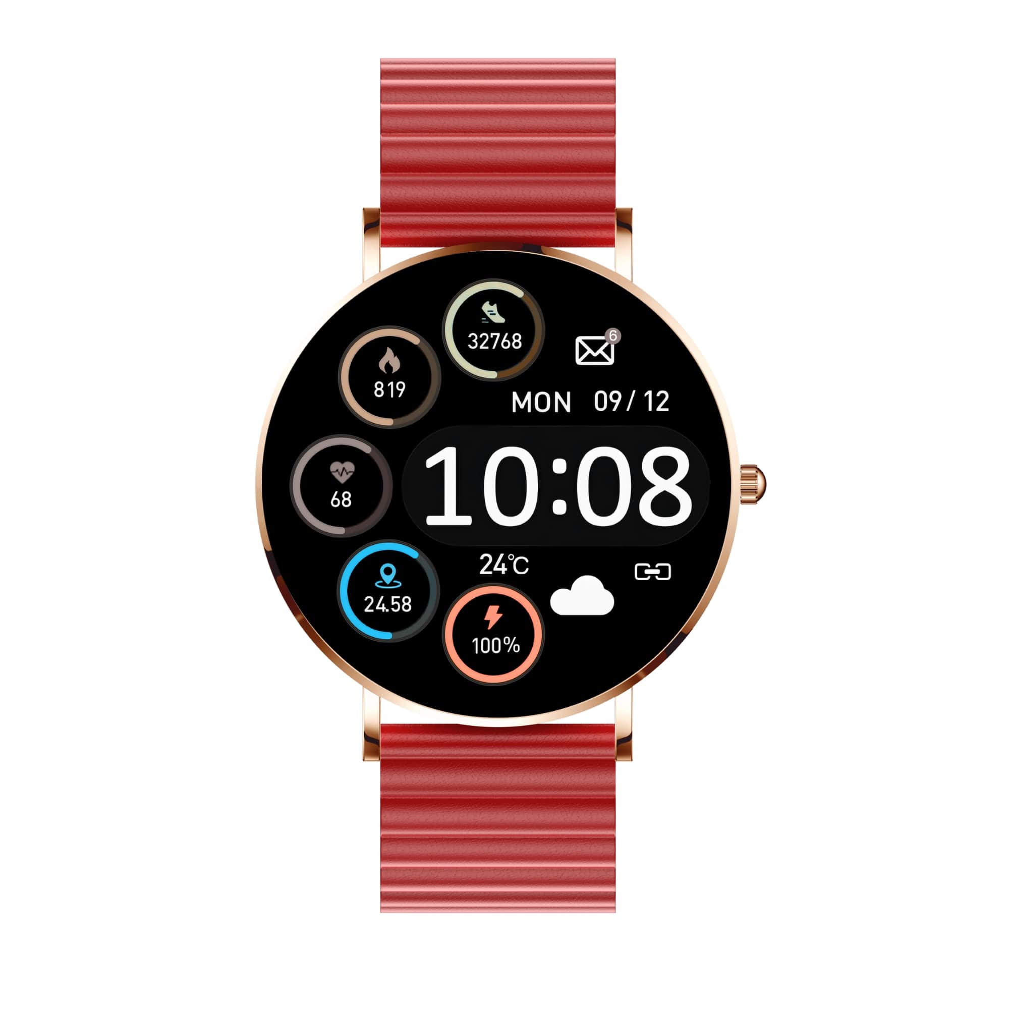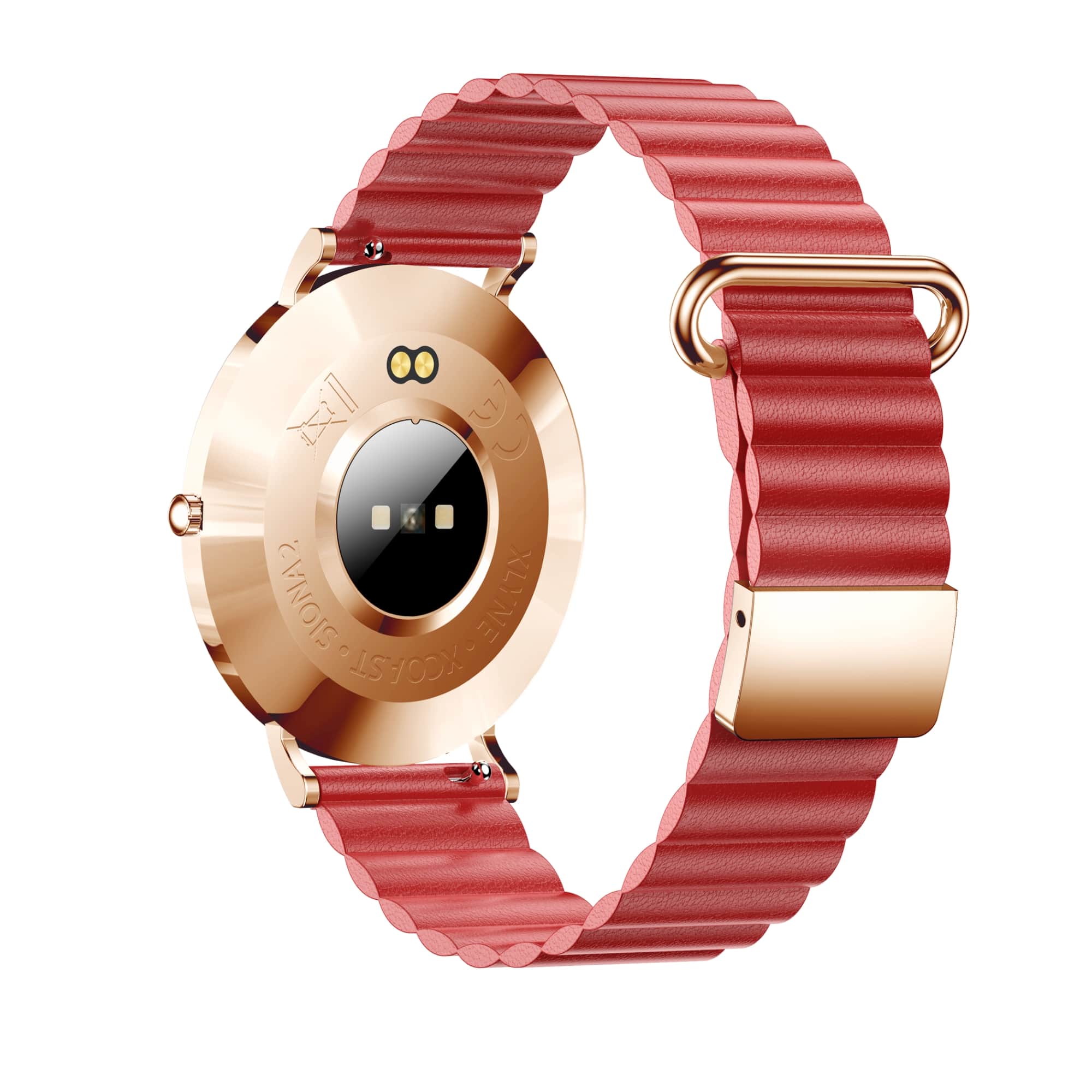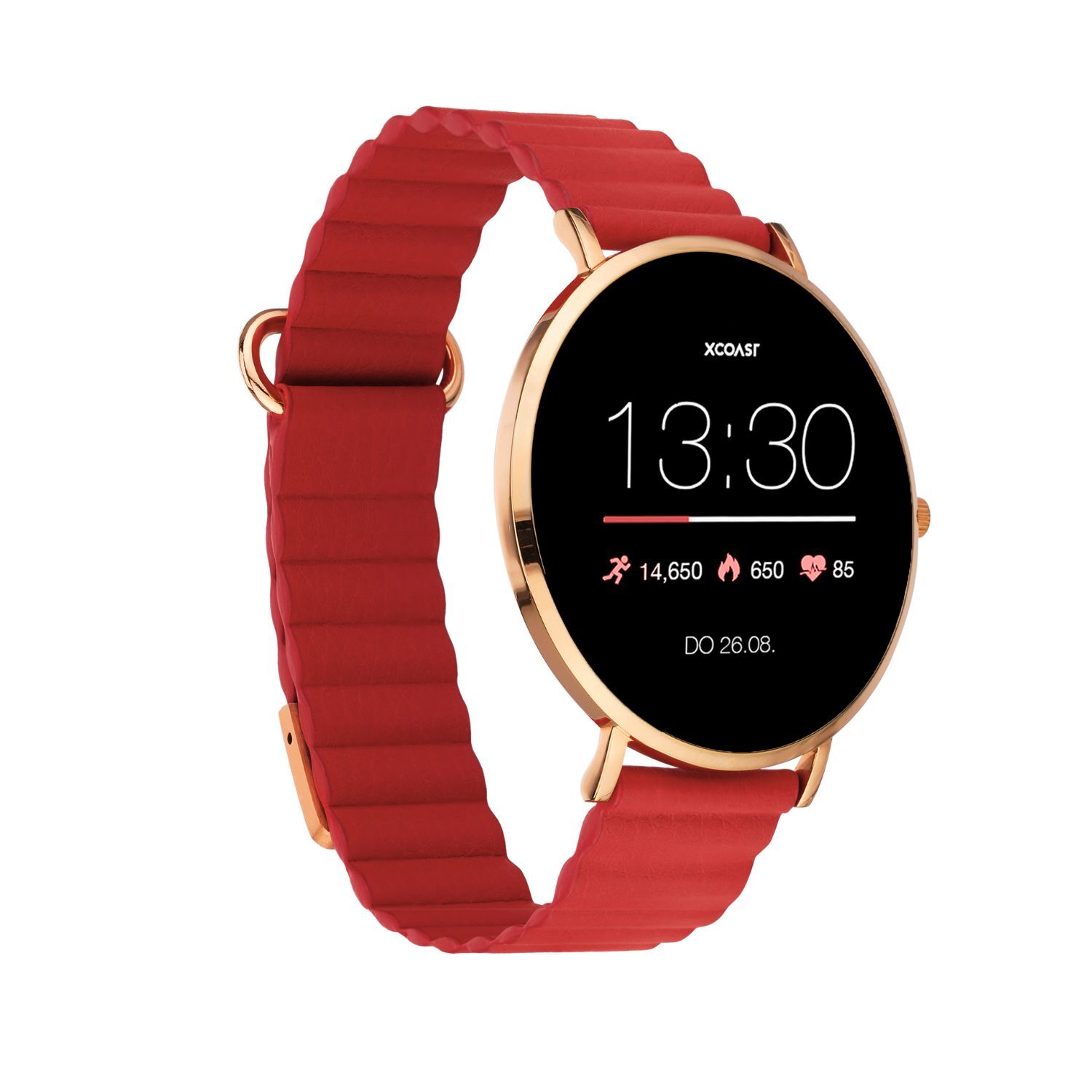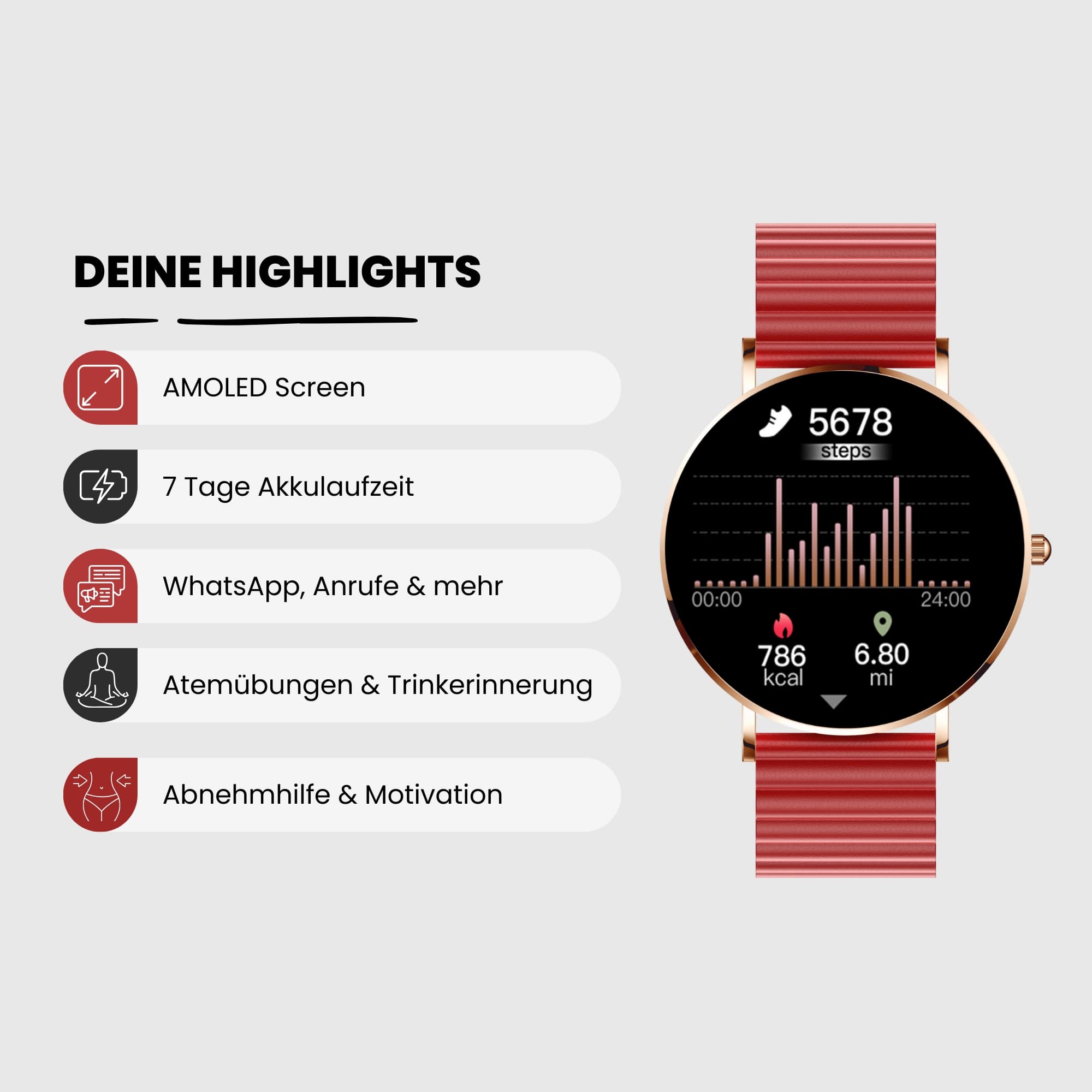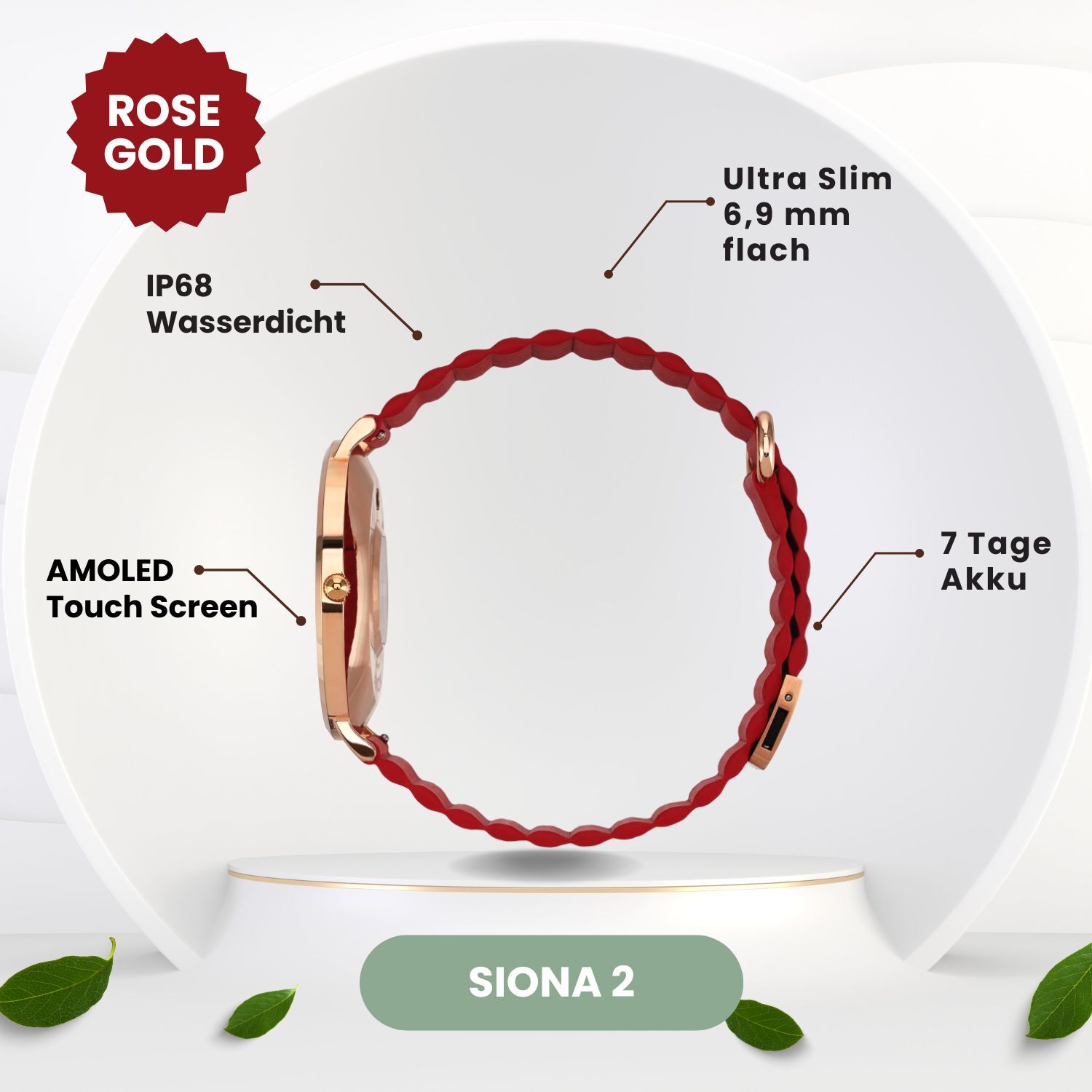 Entdecke die zeitlose Eleganz und den lebhaften Stil der SIONA 2 Wave Red Smartwatch in edlem Rosegold, kombiniert mit einem Kaminroten Echtlederarmband in edler Wellenoptik.