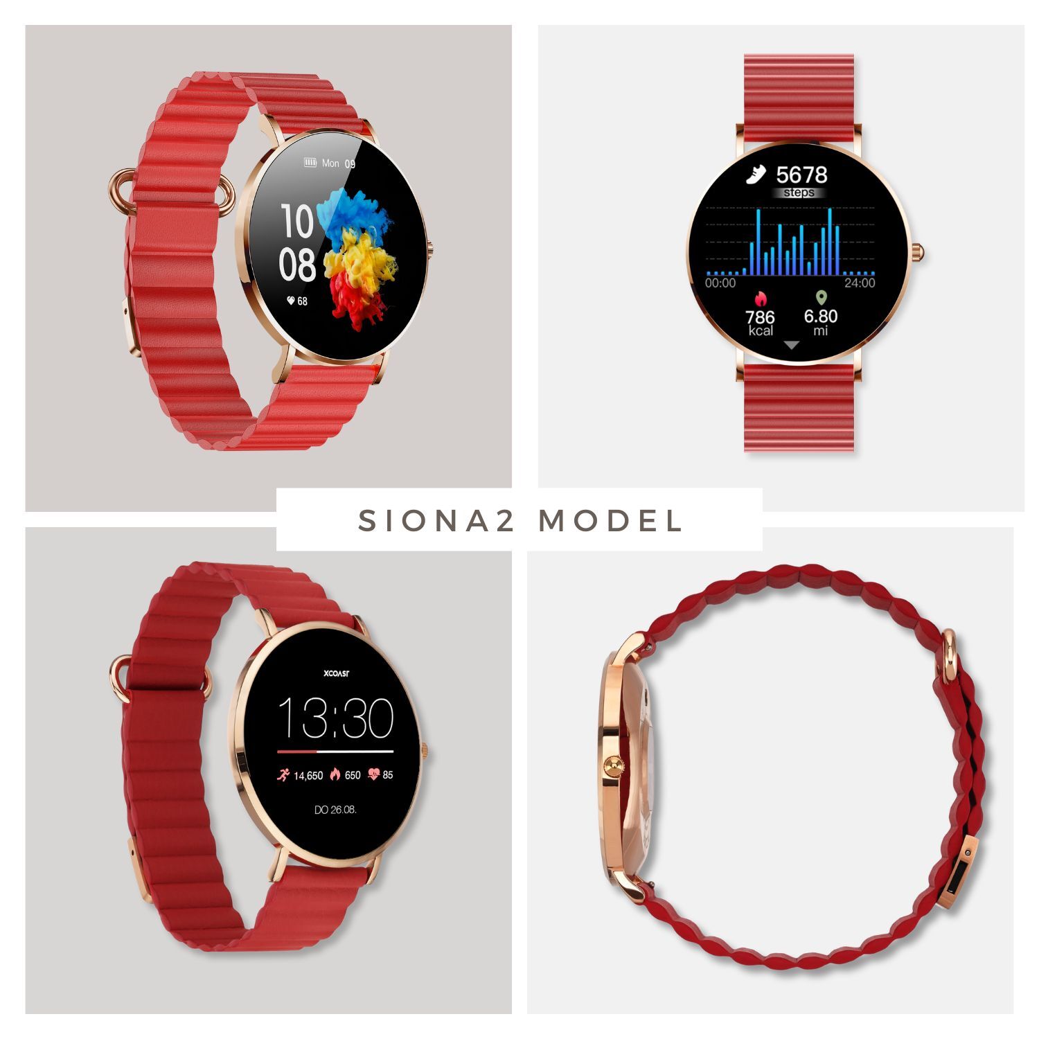 Die SIONA 2 Wave Red vereint modernes Design und technologische Raffinesse in einer stilvollen Smartwatch. Jetzt in funkelndem Roségold und ausgestattet mit einem luxuriösen super Fiber Armband in Kaminrot, das durch seine praktische Magnetverschluss und Wellenoptik besticht. Dieses Modell richtet sich an Frauen, die eine perfekte Balance zwischen Stil und Funktionalität suchen und eine Uhr benötigen, die sie durch den Alltag begleitet. Als neueste Innovation in der XCOAST-Produktlinie setzt die SIONA 2 Wave Red neue Standards in Design und Leistung, basierend auf dem Erfolg des Siona XW FIT. Egal, ob du beim Training bist, im Büro arbeitest oder eine elegante Abendveranstaltung besuchst – die SIONA 2 Wave Red ist das ideale Accessoire. Ihr schlankes Gehäuse mit einer Tiefe von nur 6,9 mm vereint den modernen Look einer Smartwatch mit dem zeitlosen Charme einer klassischen Uhr. Das lebendige Touch-AMOLED-Display bietet dir über 200 Watchfaces zur Auswahl, sodass du deinen Look immer perfekt abstimmen kannst. Zusätzlich kannst du dein eigenes Foto als Hintergrund verwenden, um deine SIONA 2 Wave Red noch persönlicher zu gestalten.