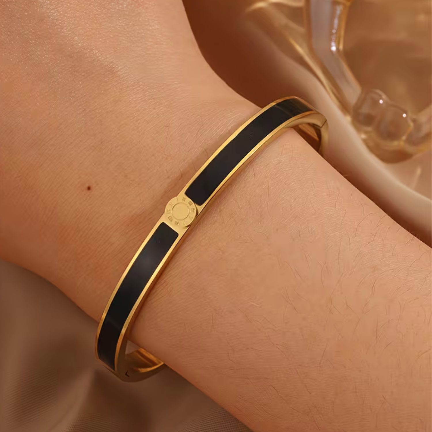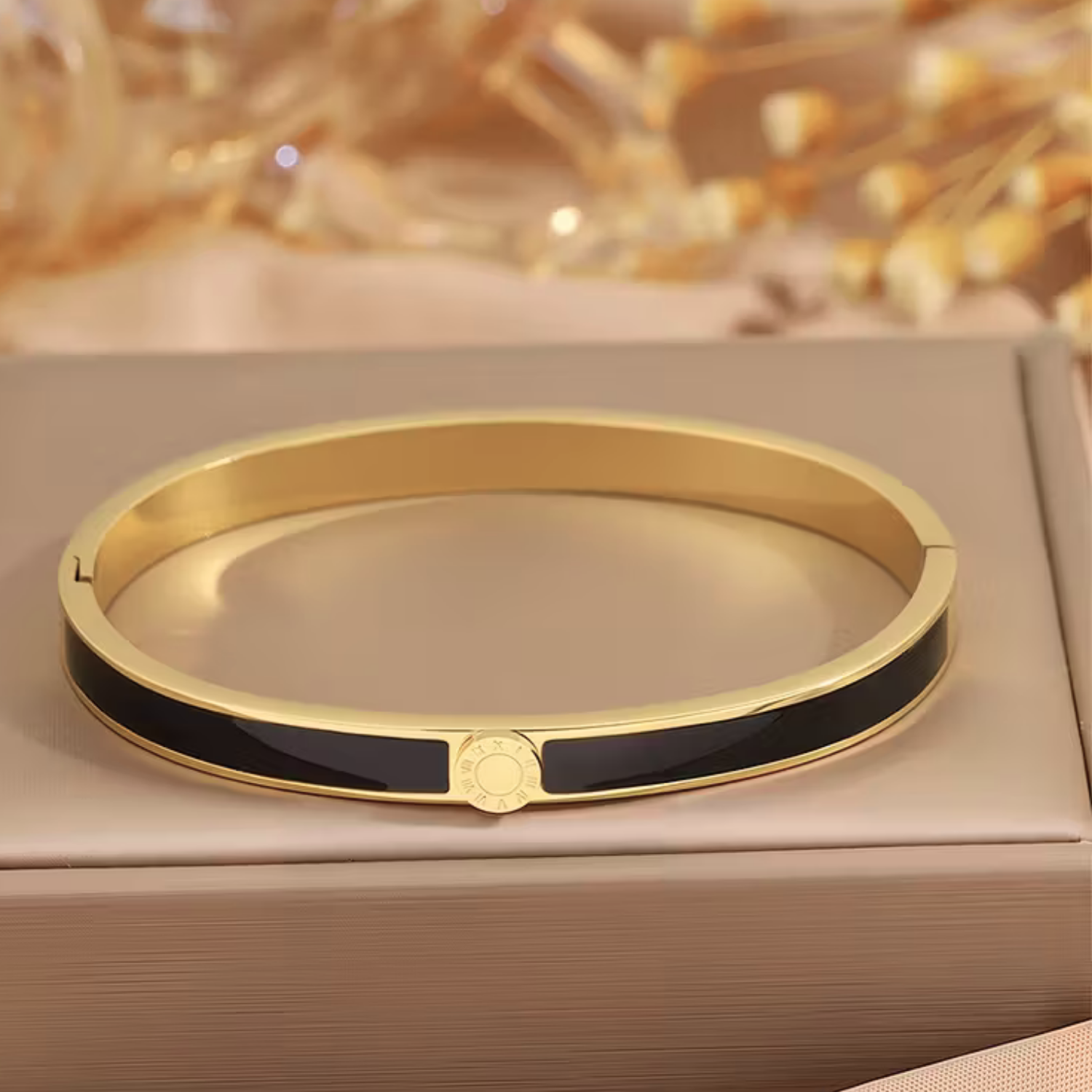Dieses Luxus Damen-Armband in edlem Schwarz verkörpert moderne Eleganz, klare Linien und feminine Stärke. Der stilvolle Kontrast zwischen der dunklen Oberfläche und der goldfarbenen Veredelung verleiht dem Schmuckstück eine zeitlose Ausstrahlung mit einem Hauch von Luxus. Perfekt für Frauen, die Wert auf ein reduziertes Design und eine elegante Wirkung legen.