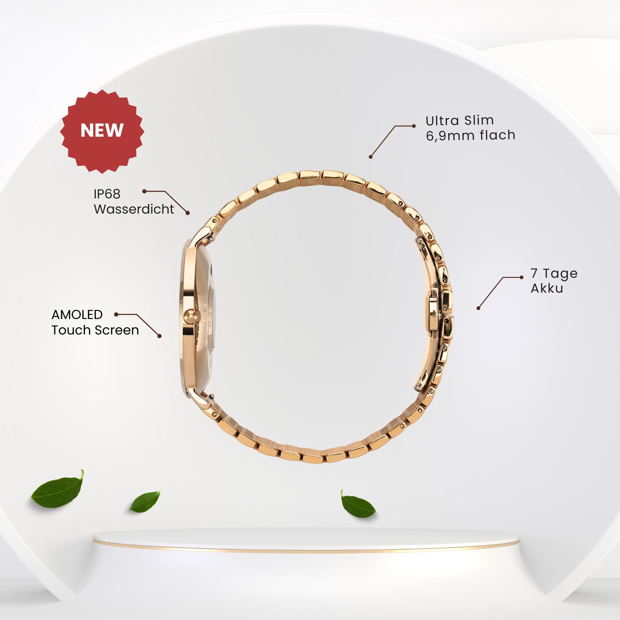 Luxuriöses Gold-Design: Entdecke die zeitlose Eleganz und den luxuriösen Glanz der SIONA 2 Smartwatch in edlem Gold.