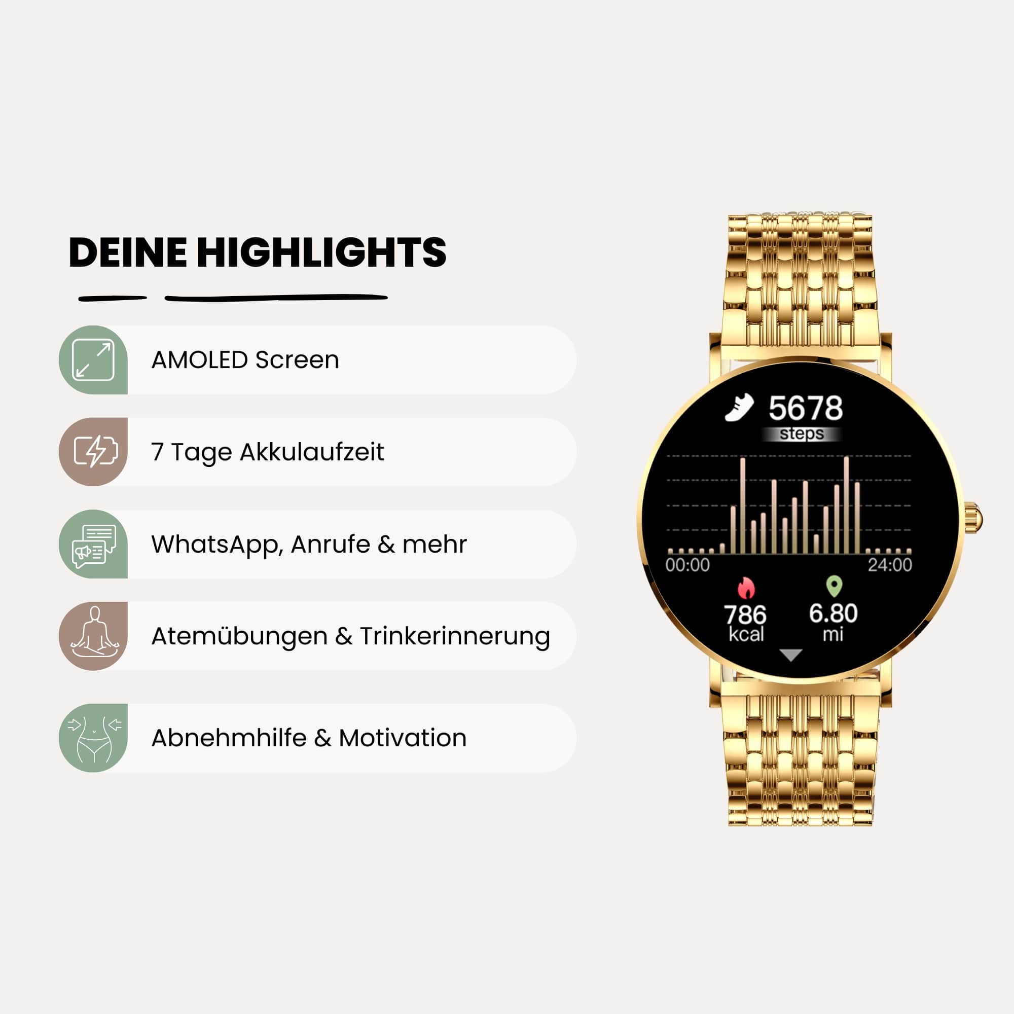 Die SIONA2 Elegance Gold eignet sich für Frauen, die eine elegante Uhr mit Gesundheits- und Sportfunktionen suchen –